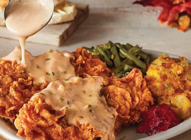 The Country Fried Turkey is another returning favorite at Cracker Barrel for the holidays. This twist on the traditional turkey plate contains hand-breaded turkey tenderloin topped with herbed pan gravy. Served with two classic sides, cranberry relish, and buttermilk biscuits or corn muffins, it’s a delicious and filling meal at any time of the day.