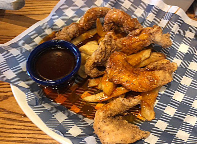 Ordering this specific summer dish was a bit of a doozy. Although it is featured on the website, I couldn’t find a mention of the new Golden Carolina BBQ sauce anywhere on the physical in-store menu (even on one of those seasonal inserts). My waitress also seemed befuddled when I asked for it with the chain’s hand-breaded fried chicken tenders. Eventually, we got it ironed out, and I ended up ordering the chicken with two sides, including fries and mac and cheese, plus biscuits over corn muffins. The dish is listed online for $11.99, although I was only charged $11.49–likely a byproduct of all the confusion.