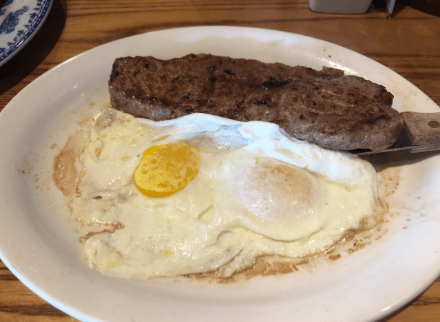 You’ve heard of breakfast for dinner, but what about dinner for breakfast? That’s essentially how I view the invention of steak and eggs. And I’m certainly not mad about it–as long as it’s done right. This Cracker Barrel plate starts like the previous steak and shrimp combo, with a 10-ounce cut topped with garlic butter sauce. Two eggs served any style–I went with over-easy–accompany the meat, as well as a breakfast side and buttermilk biscuits. The hearty meal is priced at $18.99.