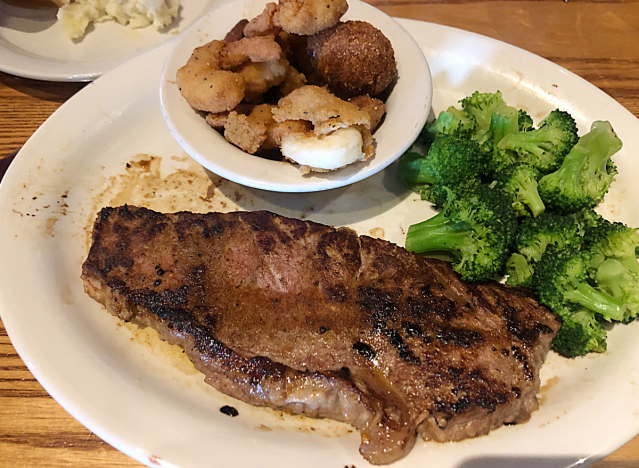 Yes, Cracker Barrel is arguably most famous for its southern-style breakfasts. The crowds that gather at the restaurant in the morning hours (especially on weekends) are clear evidence of this. But, several top-notch lunches and dinners can also be found hiding on the menu including a few of my personal favorites like chicken and dumplings and the southern fried chicken. The chain decided to diversify by adding multiple New York Strip Steak meals to its heavily poultry-based lineup. One such meal offers some surf and turf action with a pairing of fried shrimp. The 10-ounce steak is said to be served with garlic butter sauce and the entire entree with a supplemental choice of two country sides and bread cost a total of $22.99.