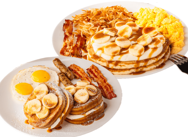 - Everyday Value Slam (choose from two buttermilk pancakes, two slices of Brioche French Toast or a biscuit & gravy. Served with two eggs cooked your way, plus two Applewood-smoked bacon strips or two all-pork sausage links).