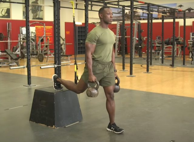 One of my favorite single leg movements is the Bulgarian split squat, and you can do it with a forward lean to really emphasize the glute. As you come down and up, maintain tension in your heel and your hip. If done right, your glutes should be on fire during the set. Shoot for 3-4 sets of 8-10 reps each leg. And for more news that can help you get healthier starting now, see here for The Secret Trick for Better Exercise, Says New Study.