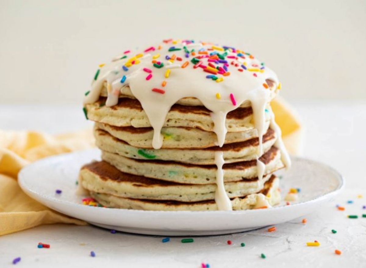 Funfetti cake mix, which is most closely associated with DIY cakes and cupcakes, makes an appearance in this pancake recipe which is perfect to serve during birthday breakfasts. Its secret? Instead of syrup, these pancakes are topped with homemade vanilla icing and rainbow sprinkles. (In case you’re curious, this is the real difference between white, yellow, and vanilla cake.)