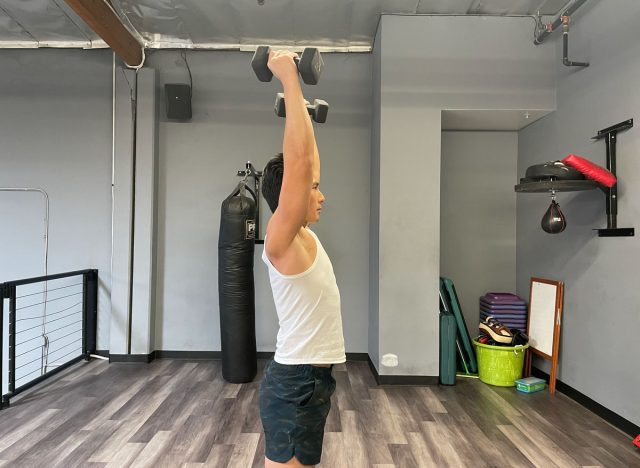This is another example of a solo exercise for new moms. A way to get in some upper body movement is to do shoulder presses. Hold weights of your choice above your head, and with your chest tall, glutes squeezed, and core tight, press them up into the air, then lower under control. Repeat for 10 to 15 reps. Listen to your body, and do these at the pace that works best for you.