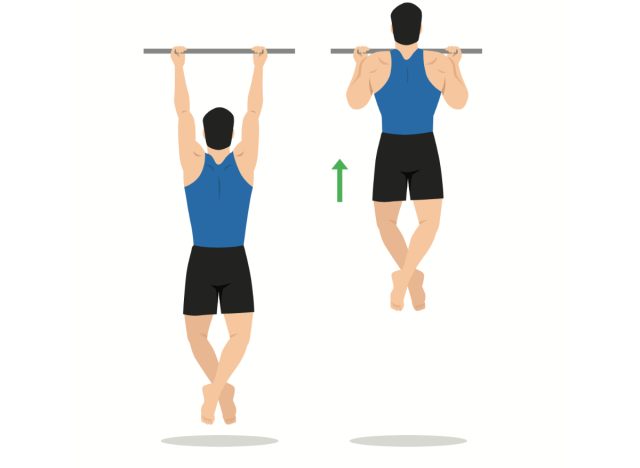 To perform a pull-up, grab the bar with both hands, palms facing toward you slightly wider than shoulder-width apart. Hang onto the bar with your arms fully extended. Pull yourself up by bending your elbows while visualizing crushing a piece of fruit in your armpit. Avoid shrugging throughout the range of motion. Once your chin is above the bar, lower yourself back to the starting position. Repeat for the target repetitions.