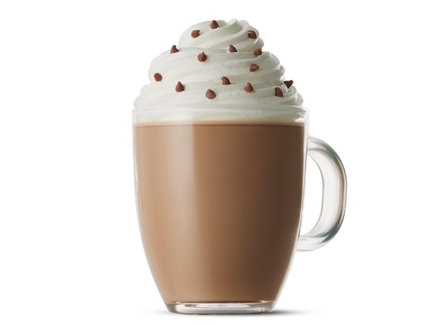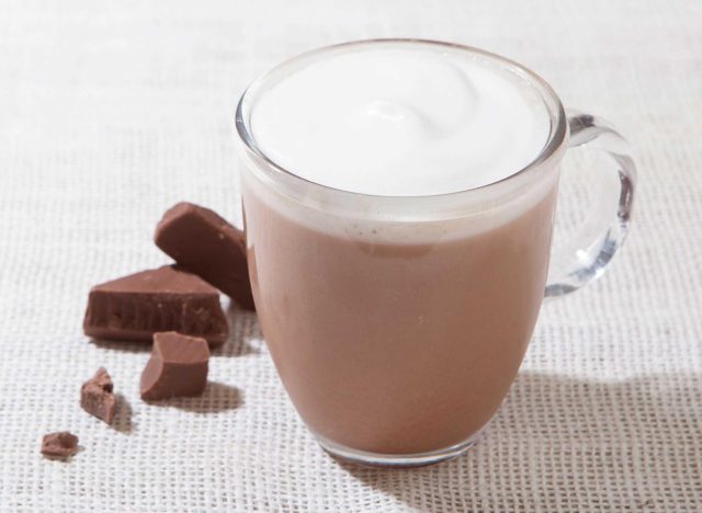 For those who like a thinner hot chocolate, McDonald’s serves it up with steamed whole milk, hot chocolate syrup, whipped light cream, and finished off with chocolate drizzle. Sounds decadent, but it’s not too rich. “The hot chocolate always tastes fresh and creamy, but not too sickening creamy,” one commenter noted on the consumer site Review Stream. “It has a chocolately flavor just right and the best part of all is the whip cream with drizzled chocolate they put on top.” In a recent taste test of fast-food hot chocolate options, Eat This, Not That! ranked McDonald’s around the middle of the pack, so that’s something to keep in mind. If you’re into lots of toppings and creamy vibes, this could be the one for you.
