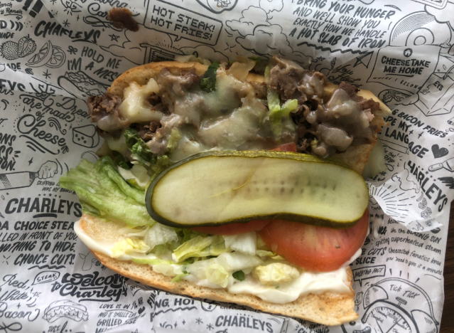 Now, one thing you should know about Charleys is that it likes to marry traditional cheesesteak components with ingredients more synonymous with a hoagie–another Philadelphia-born sandwich type. This means its combination of steak, onions, peppers, mushrooms, and provolone cheese is additionally topped with lettuce, tomato, mayo, and pickle for a diverse flavor and bold experience. I grabbed a small order of the motley mash-up for $7.49.