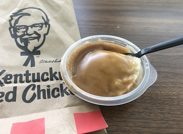 You know that KFC spins up some “finger-lickin’ good” chicken, whether it’s drums, thighs, breasts, wings, or in the form of saucy nuggets. But, no southern-style meal is complete without a couple of flavorful and filling entremets. That’s why the Colonel also has quite a few sides up his sleeve, including secret recipe fries, mac and cheese, extra buttery biscuits, coleslaw, and of course, mashed potatoes with gravy—debatably the best accompaniment for a piece of greasy and crisp fried chicken. At KFC, the potatoes always come smoothly mashed and the dressing of choice is a signature brown gravy. An individual portion of the side (not the monstrous family size) cost me $2.99 at the drive-thru.