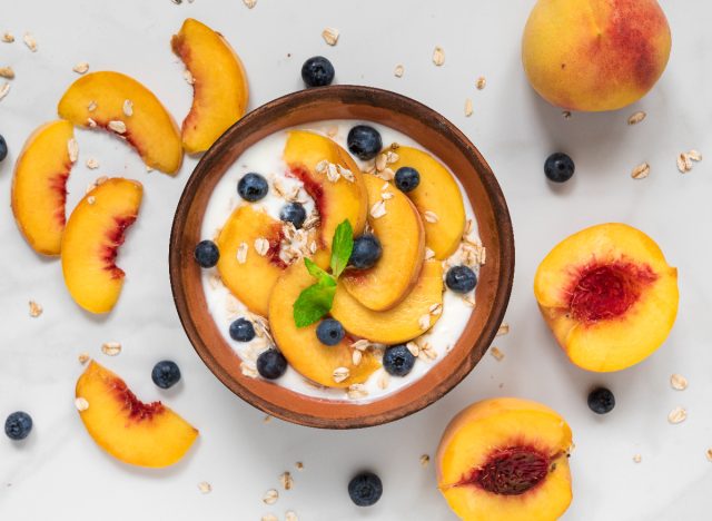 “The higher protein content of Greek yogurt can help us with feeling full for longer,” Bakovic says. Add some fresh fruit, nuts, and seeds for additional fiber and healthy fats, two nutrients that help keep you satiated. “Greek yogurt is a great snack option, a breakfast ingredient, and smoothie add-in for a protein boost,” Bakovic says.