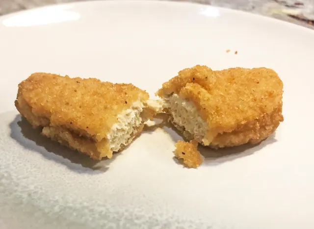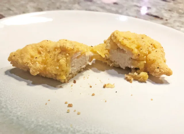 The Look: Undoubtedly the smallest of all the chicken contestants, and probably a better fit for the nugget family. The breading is browner than you would typically expect and it even graduated to another shade darker while in the oven. Real oat flecks can also be seen stuck to the outside of each piece. As for the inside contents, it’s definitely darker than real chicken meat, and looks more like some kind of bread-based product–which, judging by the ingredient list, may not be too far off.