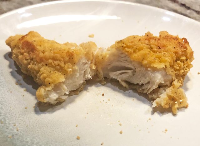 The Taste: Toothsome perfection. This chicken tender has the longest cook time of any in this survey at 25 minutes—and for good reason, have you seen the size of it?—but it is worth every second. Juice dripped off the chicken as I bit into it, and the breast actually revealed itself to be much thicker than Tyson’s, which became clear as I continued eating. My mind also quickly snapped back to the chicken in my great grandma’s chicken and dumplings recipe—a very welcome flavor memory, to say the least. The exterior crust develops a nice snap and adds depth rather than overpowering the meat, as well.