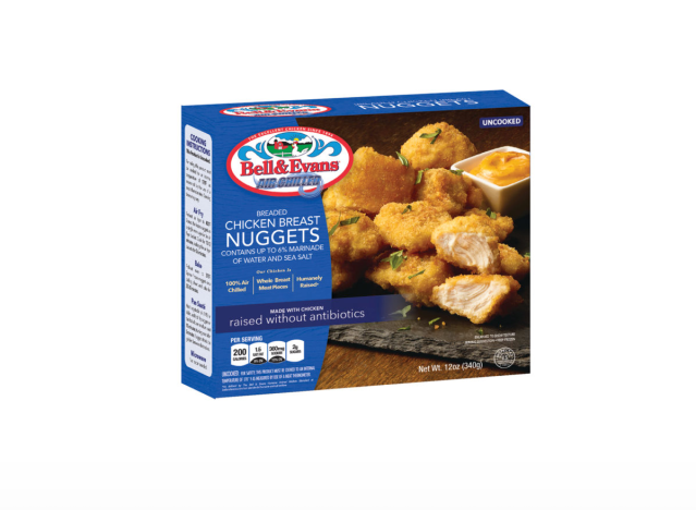 Bell & Evans Breaded Chicken Nuggets are “100% whole breast meat pieces,” according to the company, and are “not mechanically chopped or separated meat,” and are air-chilled. The lightly breaded treat is packed with protein, and, while frozen, it is actually raw, so it requires a longer cooking time than other brands.