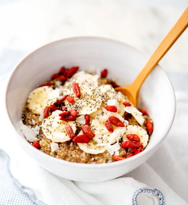 This Superfood Quinoa Breakfast Bowl is sure to supercharge your morning. Topped with hunger-quelling chia seeds and metabolism-boosting goji berries, you’ll be burning calories and rearing to go after just one bowl.