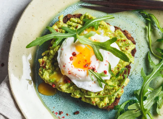 In addition to the benefits of the avocado, “a whole grain slice of toast will also contribute to the fiber content of the meal, and whole grains are excellent for gut health and maintaining balance in your microbiota,” says Young. “Furthermore, eggs are a great source of protein, and protein can help decrease appetite and hunger levels, as well as strengthen your muscles and bones.”
