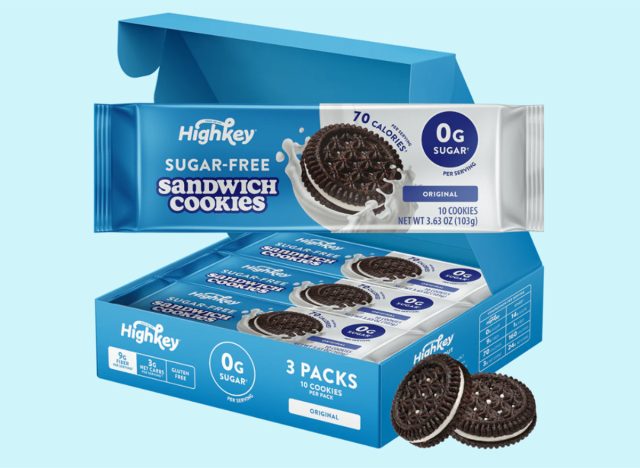 High Key Sugar-Free Sandwich Cookies may seem, at first, to offer a healthy alternative to sugar-laden cookies (we’ll admit it, we do like the 9 grams of fiber), but this cookie actually contains some dubious ingredients. So that these gluten-free cookies can boast zero sugar, these cookies contain erythritol. This sugar substitute may, unfortunately, raise your risk of cardiovascular events, and some people may experience stomach discomfort if too much is eaten. In the end, a little bit of real sugar consumption is okay – just remember that the key to health is all about moderation.
