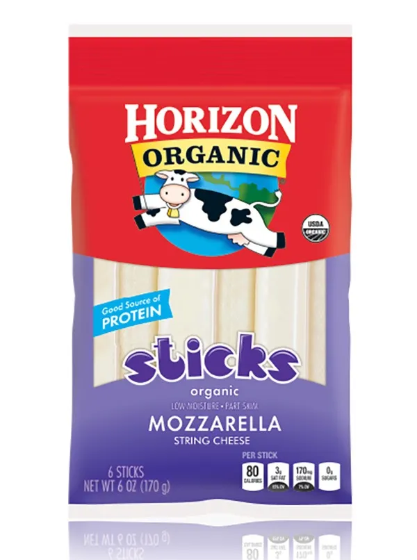 Horizon Organic Mozzarella String Cheese: 80 calories, 2 g fat (3 g saturated fat), 170 mg sodium, 8 g protein