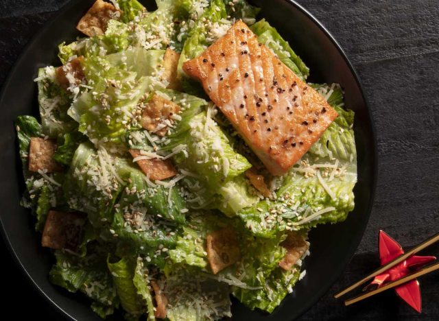 This salad is made with romaine, parmesan, toasted sesame seeds, and wonton croutons with a classic Caesar dressing. Without added protein, like chicken or salmon, this is a lower-calorie starter for a main course. You can always add chicken or salmon and turn it into a hearty meal. Adding chicken or salmon will add 140 or 160 calories to the salad respectively.