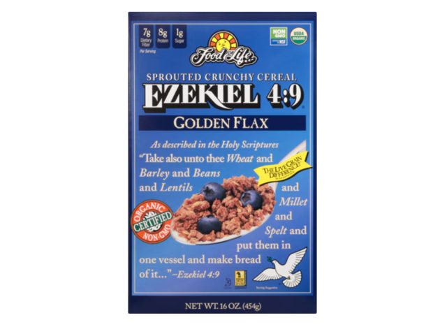 During your next grocery store run, keep your eyes peeled for Ezekiel 4:9 Flax Sprouted Crunchy Cereal. This option provides a whopping seven grams of fiber and eight grams of protein within a 1/2 cup serving.