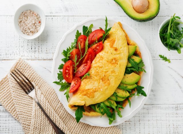 Make yourself a veggie omelet with avocado and whole-grain toast to keep you sustained through the day. “Eggs are a high-quality protein that helps maintain lean muscle and satiety. The fiber and healthy fats keep blood sugar steady and prevent mid-morning cravings. An omelet loaded with veggies gives you protein plus fiber, a combo that helps keep hunger and belly fat in check,” she says.