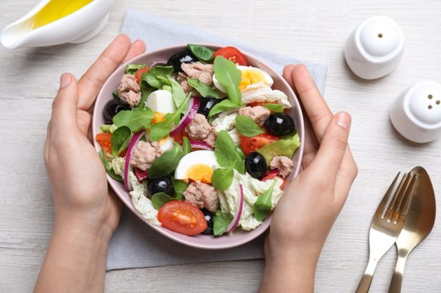 A Salmon Salad (or Tuna) with Mixed Greens is another recommendation. “Fatty fish like salmon offer protein plus omega-3 fats, which support satiety and brain function, which is helpful for staying focused through the afternoon. Works equally well with canned salmon or tuna for convenience,” says Collingwood.