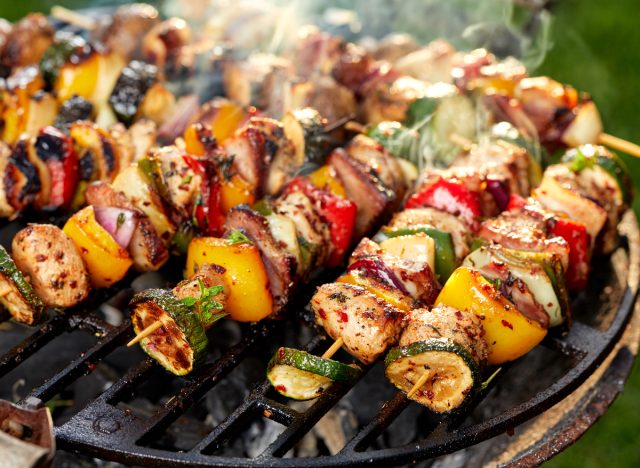 “This Mediterranean dish combines grilled seasoned chunks of chicken breast with onion, various colored peppers, cherry tomatoes, and zucchini over a bed of lemony farro,” Michelle Rauch, Registered Dietitian / Nutritionist specializing in Clinical Nutrition and Medical Nutrition Therapy says.