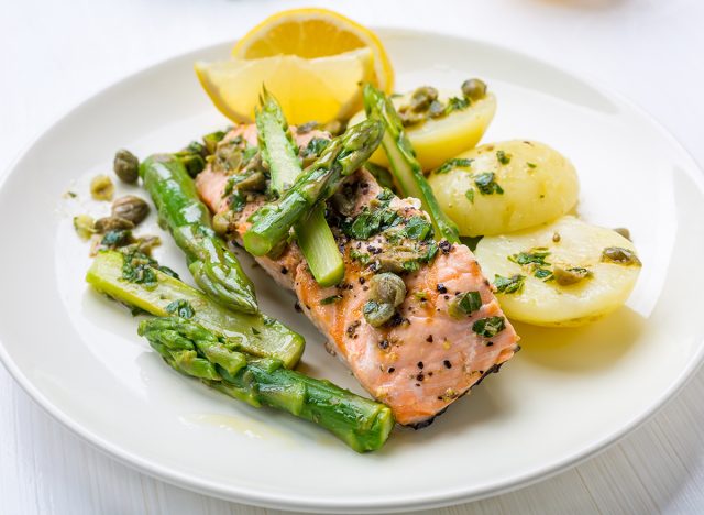Sauceda adds, “Salmon is one of the best sources to get omega-3s which is a healthy fat that many of us don’t get enough of. Omega-3s are known for their anti-inflammatory effects which can extend to metabolic health. Having good metabolic health can be a factor for losing belly fat.”