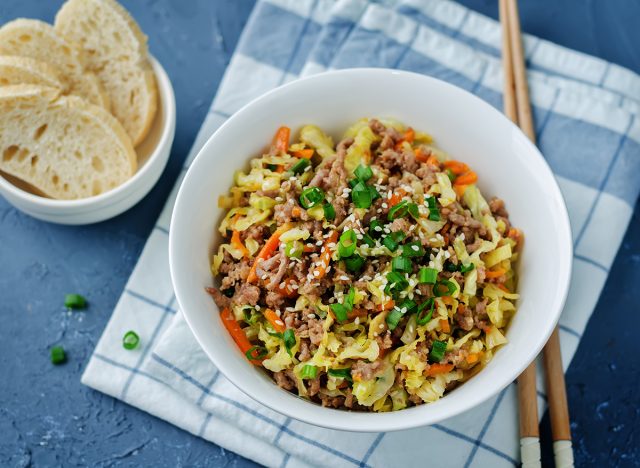 “Ground turkey and cabbage stir fry is a quick, easy high-protein dinner that helps melt belly fat by prioritizing protein and fiber,” says Schuster. “When meals are flavorful (like a stir fry with teriyaki sauce) and high in protein/fiber, they help keep you full and satisfied, so you’re not reaching for the ice cream after dinner. Stir fries are a quick and easy way to get dinner on the table, you can always add microwaved brown rice for a little more bulk and fiber.”