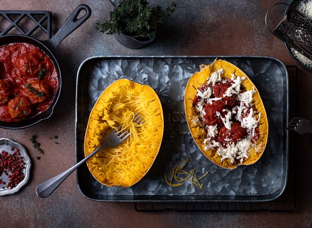 For a high-protein and low carb meal that will keep you full and satisfied, Schuster recommends turkey meatballs with spaghetti squash.