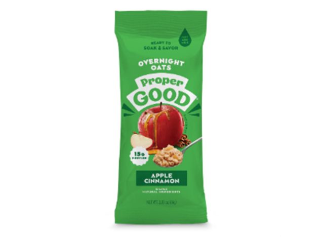 Overnight oats is a great morning time saver, allowing the oats to soften in liquid overnight in the fridge. Proper Good has a line of high-protein overnight oats in flavors like Peanut Butter, Chocolate, & Banana and Apple Cinnamon with 15 grams of protein per serving. The apple cinnamon whole-grain breakfast cereal is low in sodium (2% of DV) and high in fiber (17% of DV), but meets 20% of the daily limit for added sugar.
