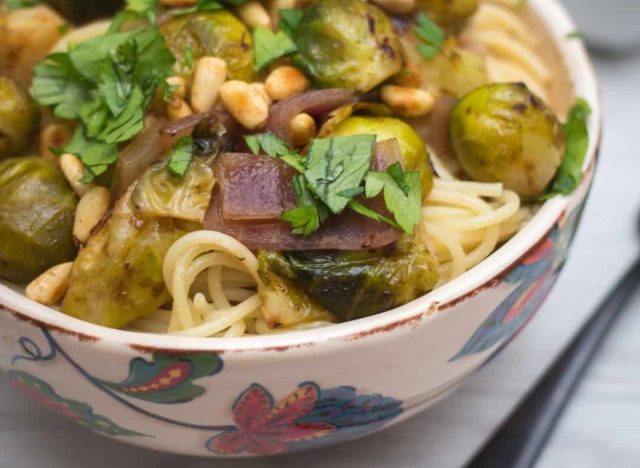 Forget making “plain Jane” noodles and sauce, this Brussels sprouts pasta will steal the spotlight from spaghetti and meatballs. Brussels sprouts, white wine, light cream, spaghetti, parmesan, and pine nuts come together to help you change up your pasta game. You’re going to get a total of 16 grams of protein, thanks to the hearty serving of Brussels sprouts, cream, and pine nuts.