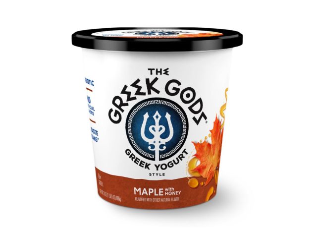 The Greek Gods Maple With Honey Greek Yogurt doesn’t even contain maple syrup—yet it still manages to pack 15 grams of added sugar from five different sources. This flavored yogurt is sweetened with cane sugar, brown sugar, honey, sugar syrup, and molasses. So it makes sense that you’re getting double the added sugar than protein in a single 1-cup serving of this Greek yogurt.