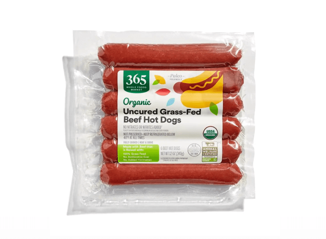 Whole Foods brand 365 Everyday Value Organic Uncured Grass-Fed Beef Hot Dogs are made from grass-fed beef without any nitrites, nitrates, antibiotics, or hormones. “These are great hot dogs. The flavor is awesome. They have a good snap and they are juicy,’ one Amazon shopper said.