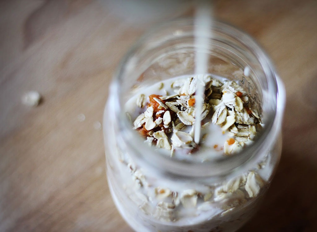 In a healthy twist we love, this recipe asks you to make quick jam out of nothing more than mashed berries, chia seeds and a touch of honey to layer or swirl in your oatmeal. If ripe raspberries are sweet enough for you already, simply omit the sweetener for an even lower sugar count. Resist the urge to switch to a different berry; raspberries pack more fiber and liquid than most other fruits, boosting feelings of satiety – and keeping you away from the office snacks.