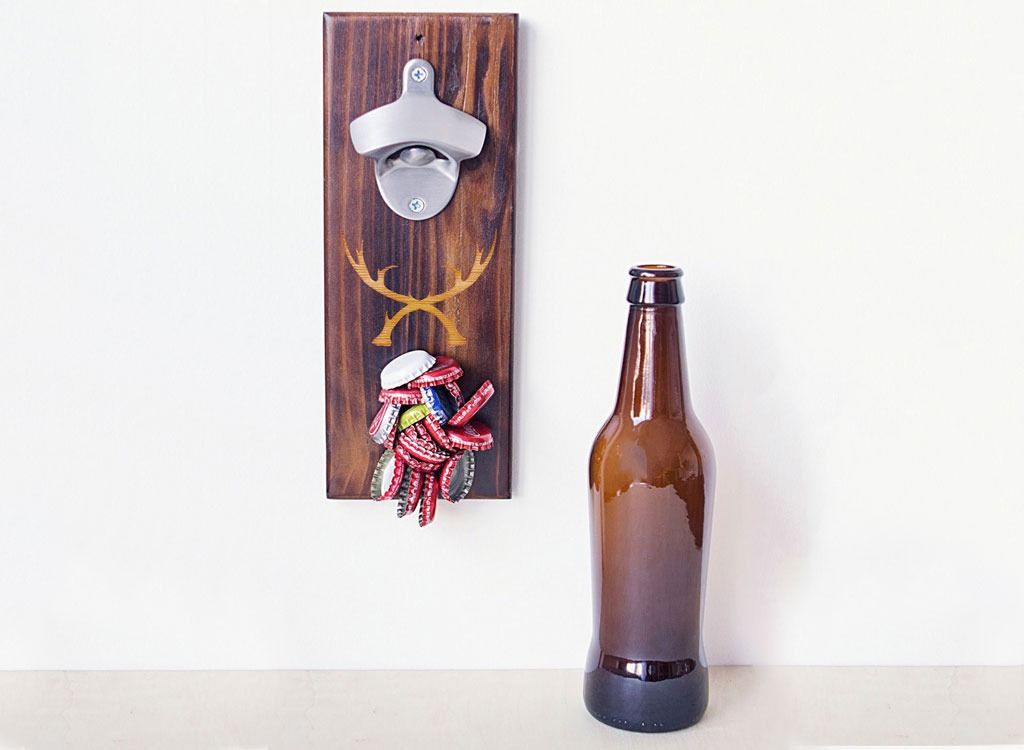 Upgrade your bar area with this rustic, richly-grained fir wood bottle opener. Surprise your guests as they open a cold one and try to catch the cap only to see it magically (magnetically) sticks to the wood!