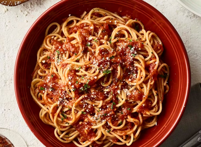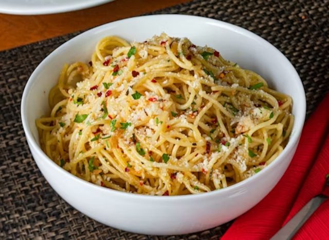 If you want a quick pasta meal for super cheap, head to Noodles & Company. The fast casual spot offers lots of options, most under $10, including the Basil Pesto Cavatappi. If you want a protein, try the Rigatoni Rosa with Parmesan Chicken, $13.25. For a meal, try a “duo,” like the Spaghetti & Meatballs Duo For $10.95, which comes with spaghetti noodles in crushed tomato marinara with oven-roasted meatballs, topped with parmesan. Choose or swap a protein and then select a Side.