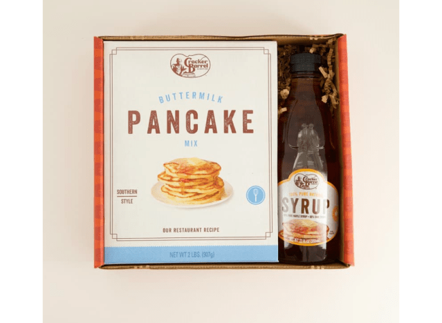 Does your recipient love Cracker Barrel pancakes? Get this Cracker Barrel Breakfast Bundle, exclusive to Cracker Barrel, $15.98. It comes with a 12oz. A bottle of 100% Pure Natural Syrup and a 2-pound box of Buttermilk Pancake Mix.