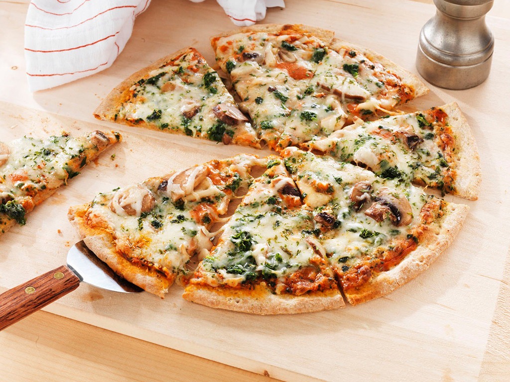 Skeptical of turkey-topped pizza? Don’t be! It’s surprisingly good. When combined with marinara, shredded fontina cheese, red onion, balsamic vinegar, and prosciutto, and arugula, turkey is a protein-rich topping to be reckoned with.