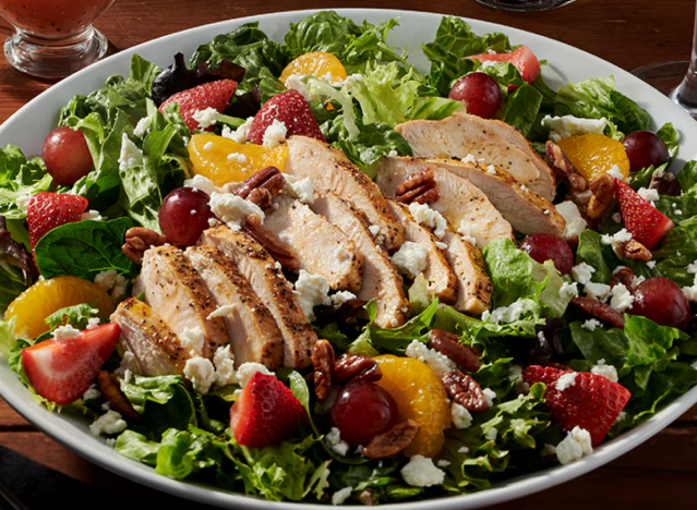 So I usually get the side salad or Caesar at LongHorn, but my boyfriend opted for the Strawberry and Pecan as one of his sides. Now it’s my favorite. It starts with a bed of farm-fresh field greens topped with fresh-cut strawberries, grapes, mandarin oranges, candied pecans, feta, and a refreshing raspberry vinaigrette.