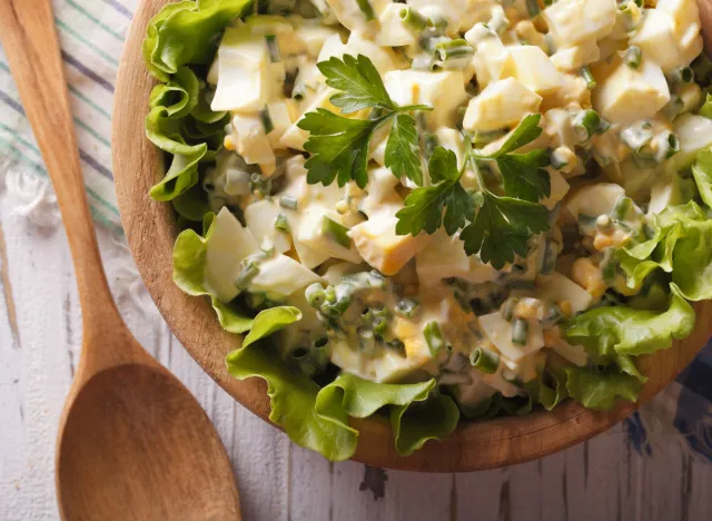 Egg salad is traditionally made with mayo, and while a lower-fat option can be used here, Greek yogurt provides a similar texture while also adding protein. Add mustard to your liking to create a flavorful, protein-packed entrée. The chickpeas boost protein further and add fiber, making this a great weight loss meal.
