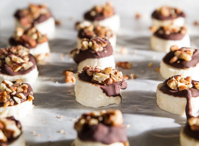 When you think of potassium-rich foods, what comes to mind? Of course, bananas. So, bananas make a great portable health snack for reducing blood pressure, since potassium reduces blood pressure. But here’s how to turn the fruit into a Popsicle-like snack treat: Freeze it and drizzle it with melted dark chocolate, suggests medical board member and registered dietitian nutritionist Lisa Young, PhD, RDN, author of Finally Full, Finally Slim.