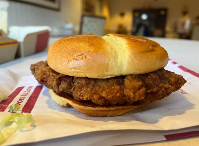 The taste: Unfortunately, this sandwich fell flat because it just didn’t have enough of anything. The promo of this chicken sandwich shows a beautiful crispy breast of chicken with sauce spilling out, adorned with lots of pickles, and exploding with bacon, but we got maybe one and a half pieces of floppy bacon and two tiny pickles—one of which wasn’t even whole.