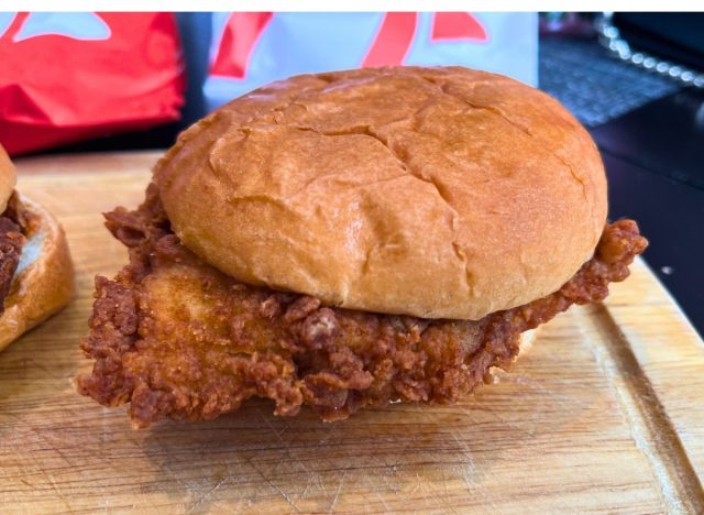 Chick-fil-A’s Spicy Chicken Sandwich is the only chicken sandwich of this batch that includes a blend of spices in the breading. Then, like the original, it is pressure cooked in peanut oil and served with pickles on a buttered bun.