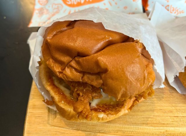 The sandwich that spawned a thousand copycats is coated with a blend of secret spices, hand-battered and breaded in the chain’s ‘buttermilk system,’ deep-fried, served on a buttered brioche bun, and topped with pickles and mayo.