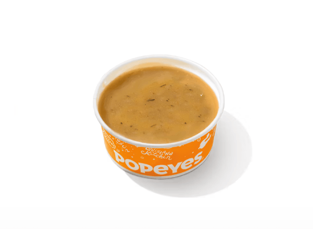 If you want a gravy with a bit of a kick, the Cajun gravy has a robust flavor with the perfect level of spice. “Popeyes’ Cajun Gravy is a Louisiana dish that features the Holy Trinity of onions, celery, and bell peppers, a staple of Creole and Cajun cuisine,” says Corrie Duffy, chef and food blogger at Corrie Cooks. “The gravy itself contains finely chopped vegetables, which shows it is made the real way.” He explains, “It’s thinner and more like broth than a regular brown gravy, but it has a strong, spicy, and fragrant flavor that is the heart of Southern Louisiana cooking. You can pour it over their dirty rice and mashed potatoes, and it’s so good that you’ll want to eat it all the time.”