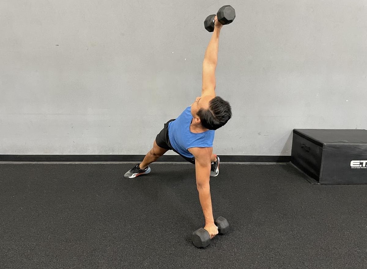 Start by getting into a pushup position with a wide stance, gripping both dumbbells that are resting on the ground. Keeping your core tight and glutes squeezed, row one dumbbell up toward your hip, then rotate the weight up and extend it straight toward the ceiling. Lower the dumbbell down back to your side in the same pattern, then return to the pushup position before performing another rep with the other side. Keep alternating sides for 30 seconds.