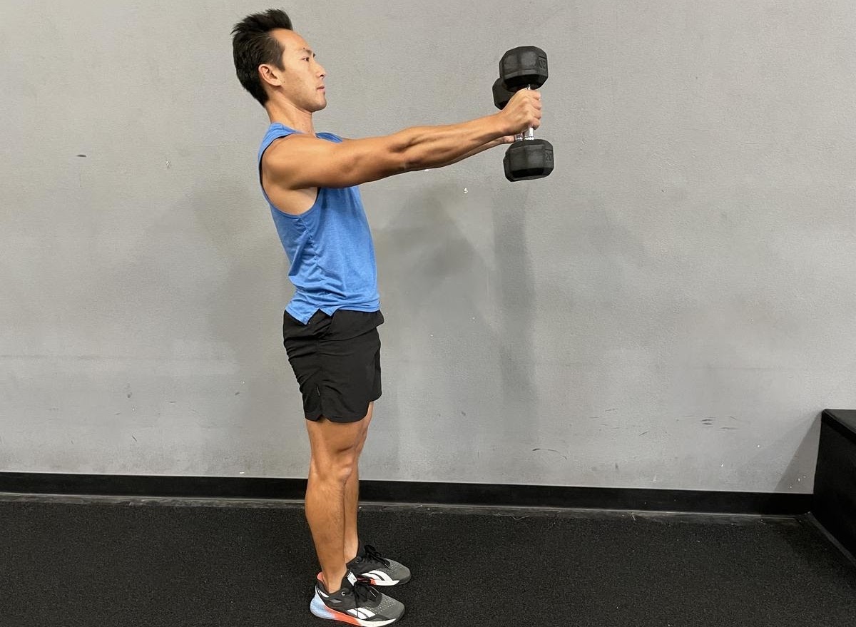 Start by standing, holding your dumbbells right by your sides. Pull the dumbbells back and swing them up in front of you using your hips, using a punching motion to extend them forward. Then, pull them back toward you and straighten your arms down to your sides. Repeat for 30 seconds.