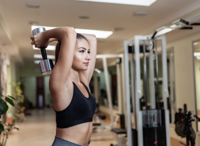 Lucky for you, Lee detailed the sequence in its entirety so you can try it out for yourself. All you need in order to get started is a pair of free weights. (Lee uses dumbbells!) For this quick workout, you will do a total of 20 push-ups, 15 overhead tricep extensions, 20 dips, 15 tricep kickbacks, and 15 lateral raises, then repeat two more times. For the full workout, read on, and next, check out The 6 Best Exercises for Strong and Toned Arms in 2022, Trainer Says.