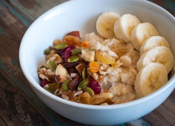 Especially in the morning when your tummy might be roaring, it’s tempting to drop a heaping scoop of oats into that pot or bowl. However, remember that a standard serving size of oats is a half-cup dry.