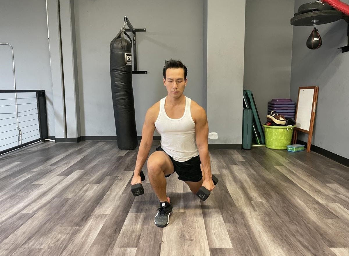 Start by standing, holding a pair of dumbbells up by your shoulders. With your chest tall and core tight, squat all the way down until your hips are parallel to the ground, then drive through your heels and hips, using the momentum of your squat to press the weights straight up over your head toward the ceiling. Lower them back down to your shoulders before performing another rep. Do 3 sets of 8-10 reps.