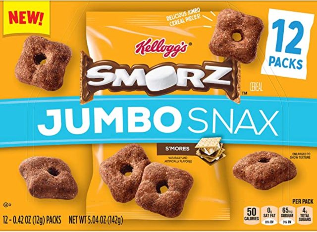 Kellogg’s Smorz Jumbo Snax are, unfortunately, really just sugar delivery vehicles with no nutritional value. They have less than a gram of protein per serving, less than a gram of fiber, and yet four grams of sugar per 50 calories. At least they are also low in fat.